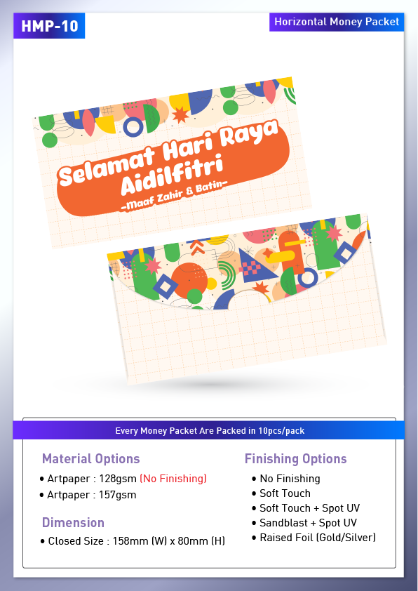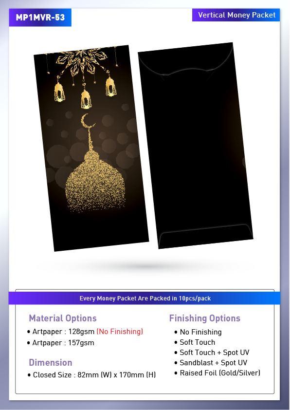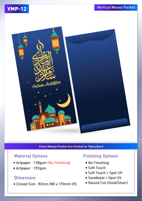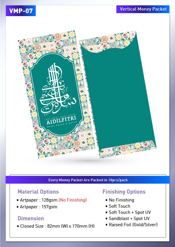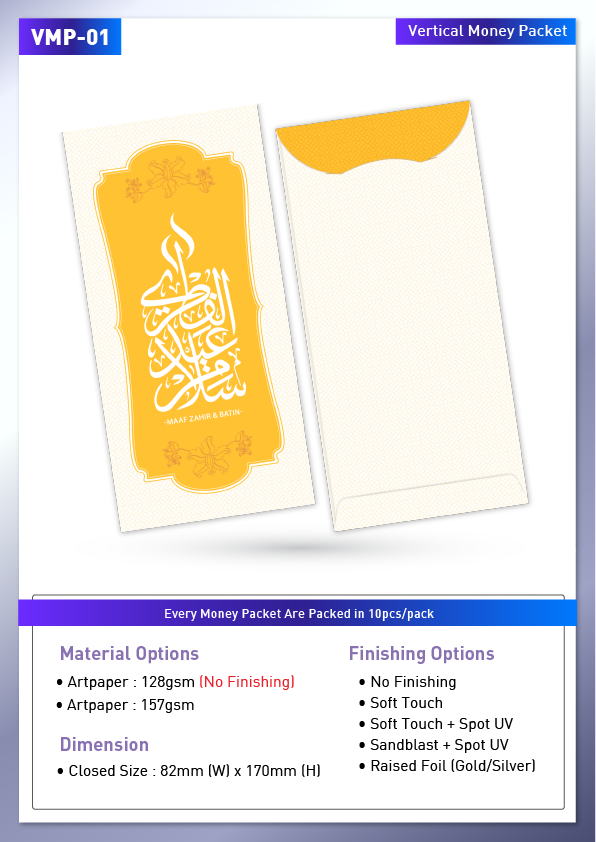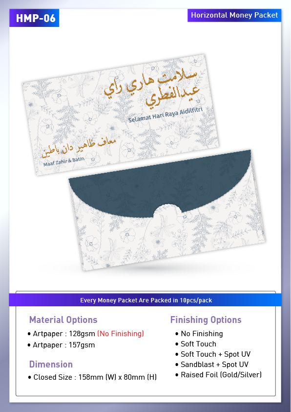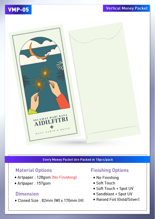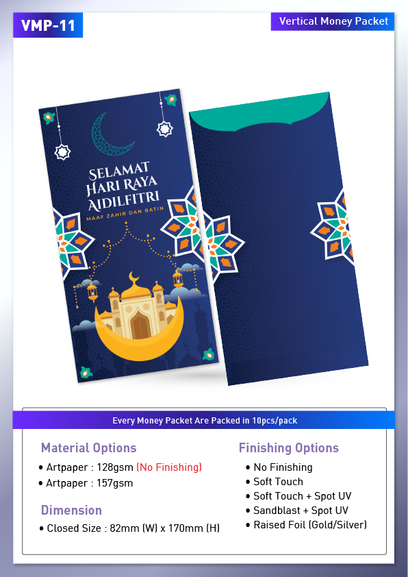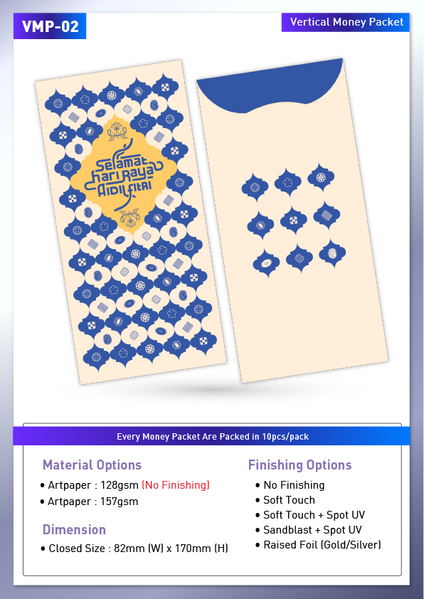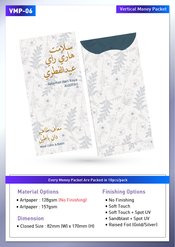 “Discover our exclusive Sampul Raya 2026 collection, featuring elegant and festive designs perfect for gifting during Hari Raya. Choose from our beautifully curated design collection and simply add your logo, or provide your own custom design for us to print for a truly personalized touch. Ideal for both corporate and personal use, our premium-quality money packets make every gift memorable this festive season.”