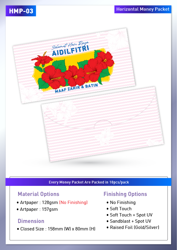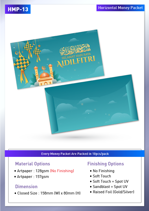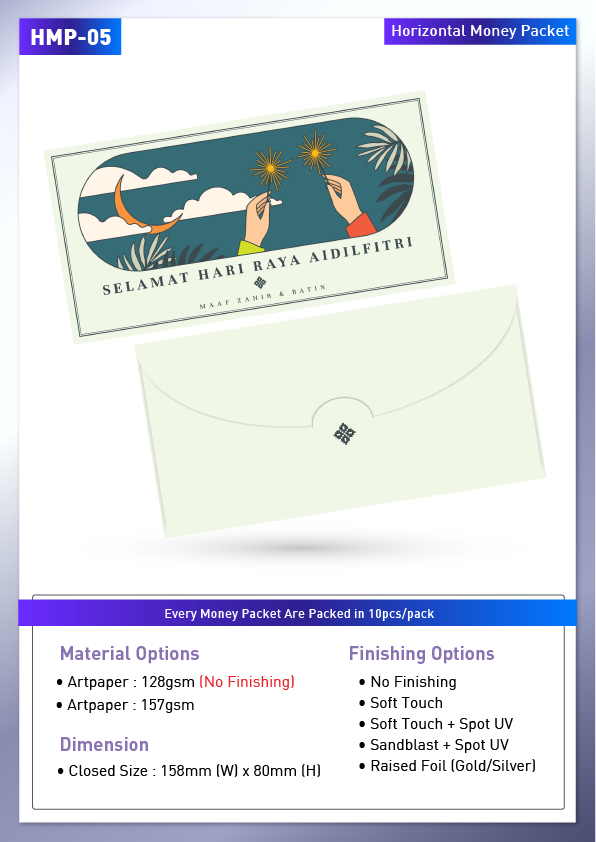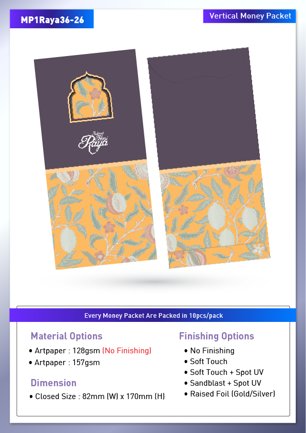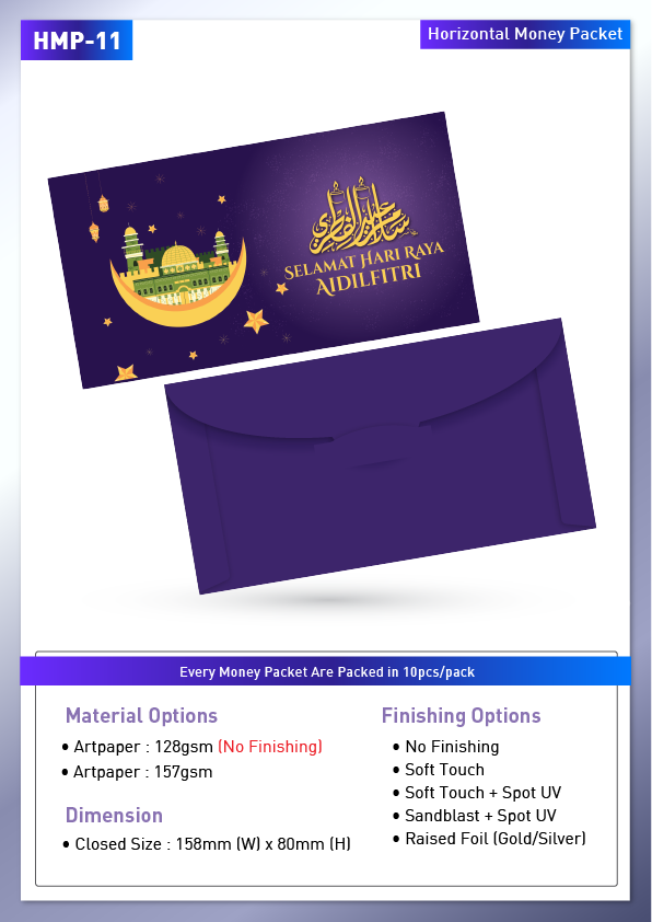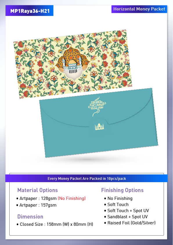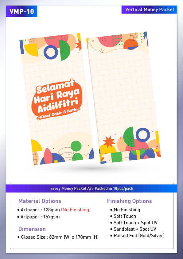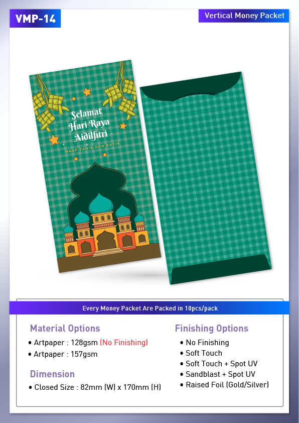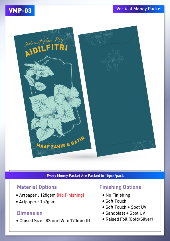 “Discover our exclusive Sampul Raya 2026 collection, featuring elegant and festive designs perfect for gifting during Hari Raya. Choose from our beautifully curated design collection and simply add your logo, or provide your own custom design for us to print for a truly personalized touch. Ideal for both corporate and personal use, our premium-quality money packets make every gift memorable this festive season.”