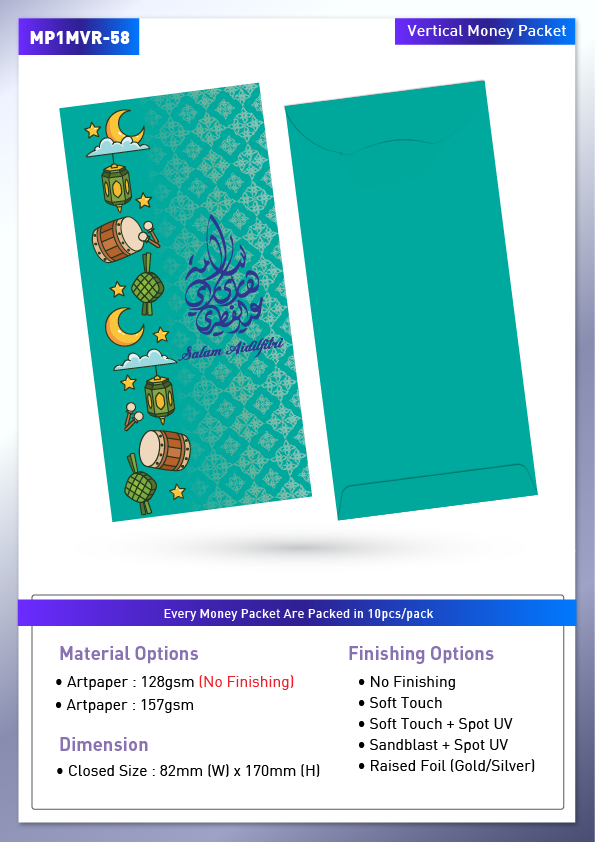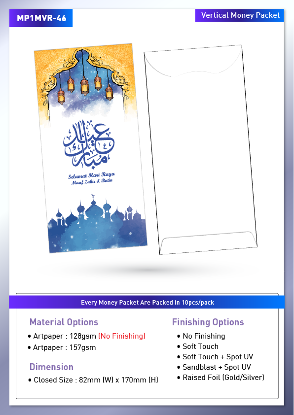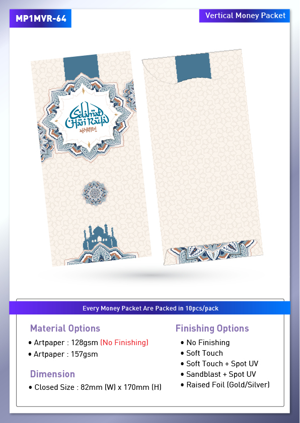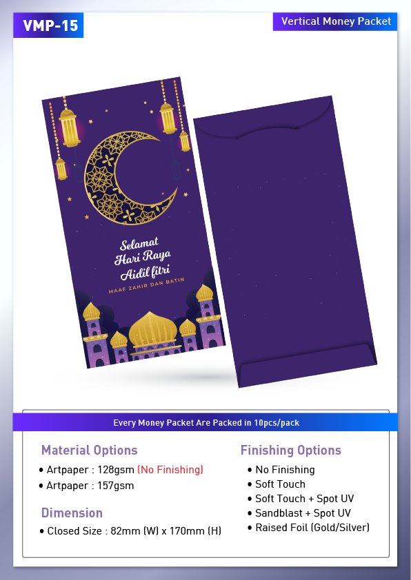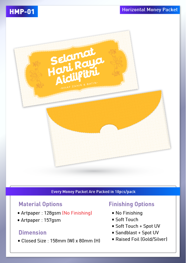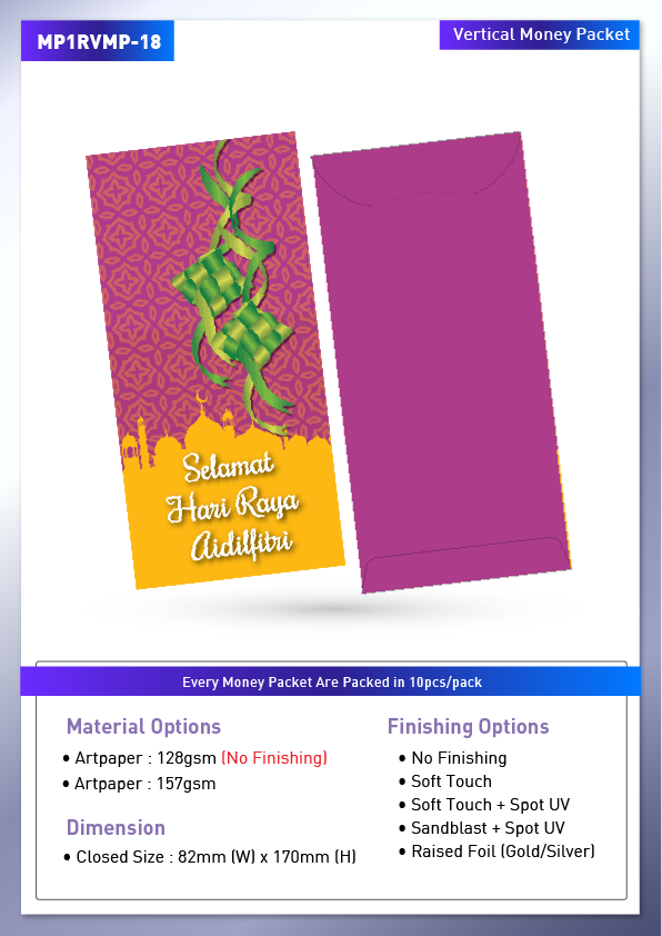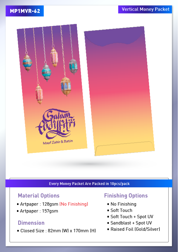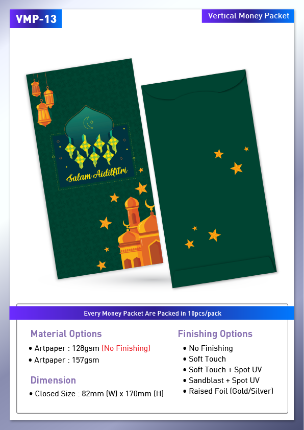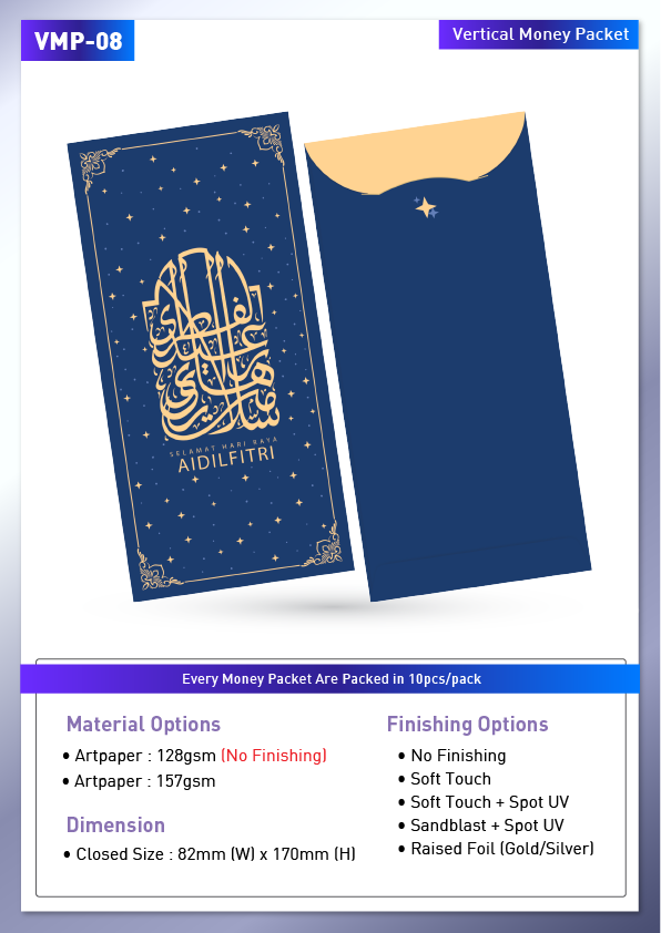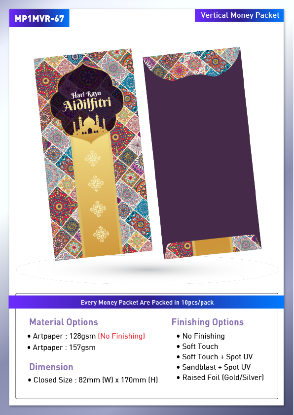 “Discover our exclusive Sampul Raya 2026 collection, featuring elegant and festive designs perfect for gifting during Hari Raya. Choose from our beautifully curated design collection and simply add your logo, or provide your own custom design for us to print for a truly personalized touch. Ideal for both corporate and personal use, our premium-quality money packets make every gift memorable this festive season.”