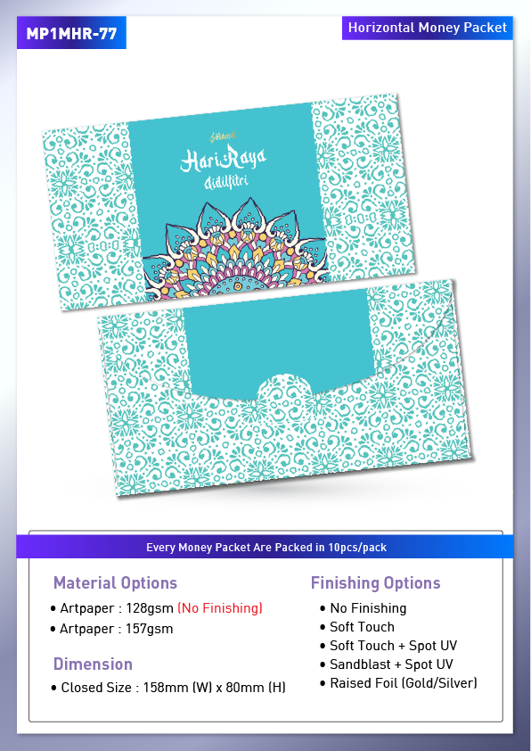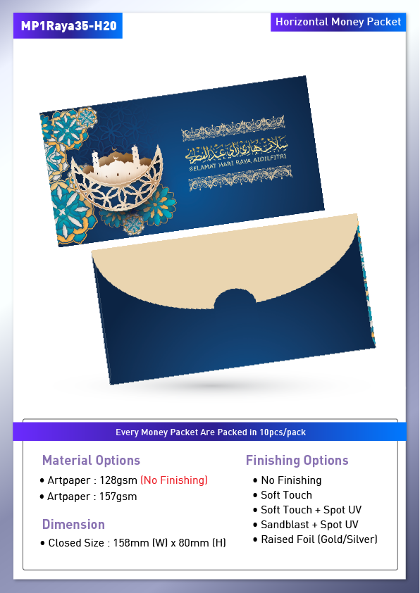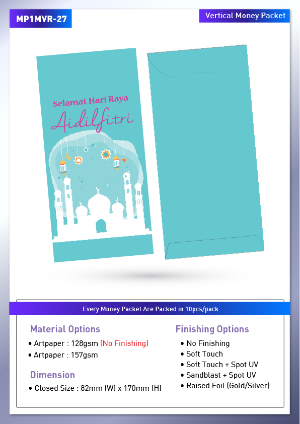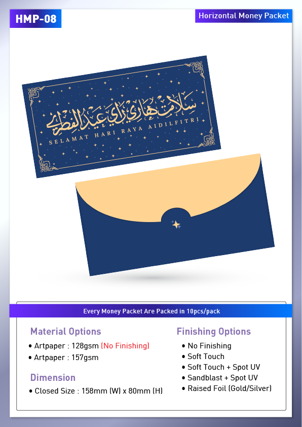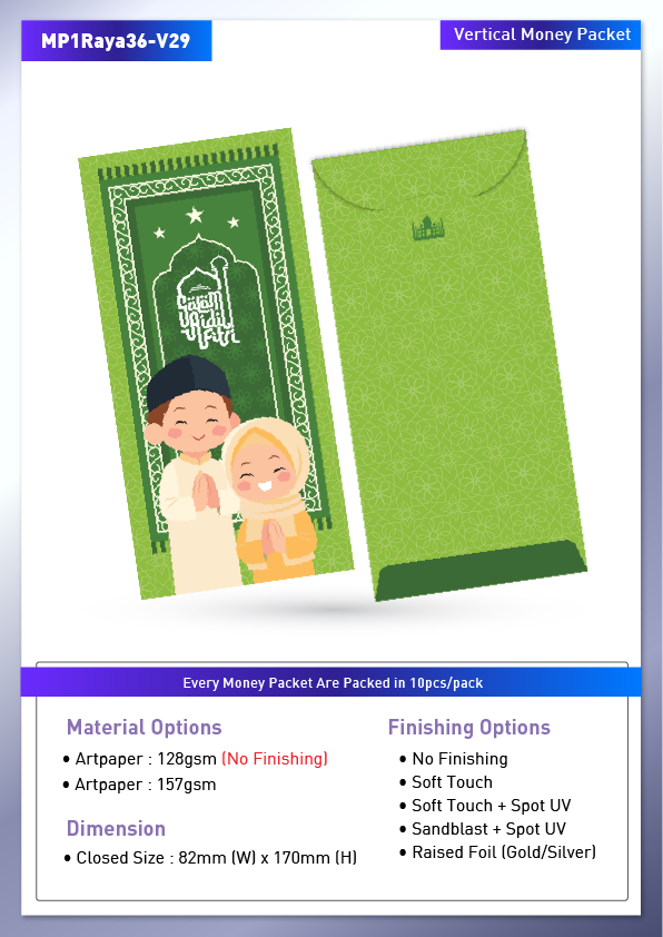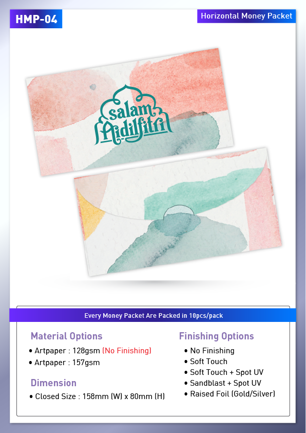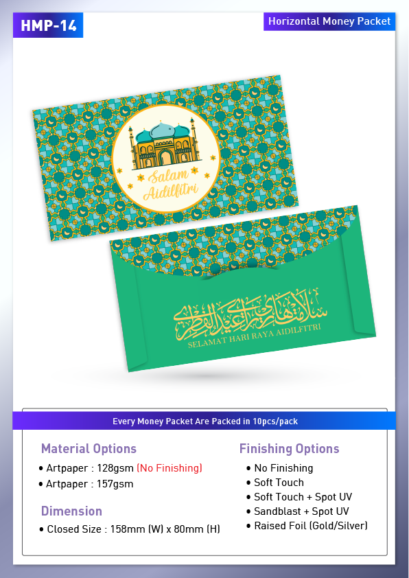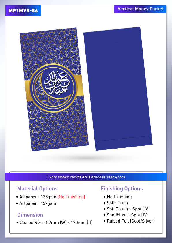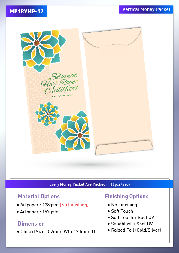 “Discover our exclusive Sampul Raya 2026 collection, featuring elegant and festive designs perfect for gifting during Hari Raya. Choose from our beautifully curated design collection and simply add your logo, or provide your own custom design for us to print for a truly personalized touch. Ideal for both corporate and personal use, our premium-quality money packets make every gift memorable this festive season.”