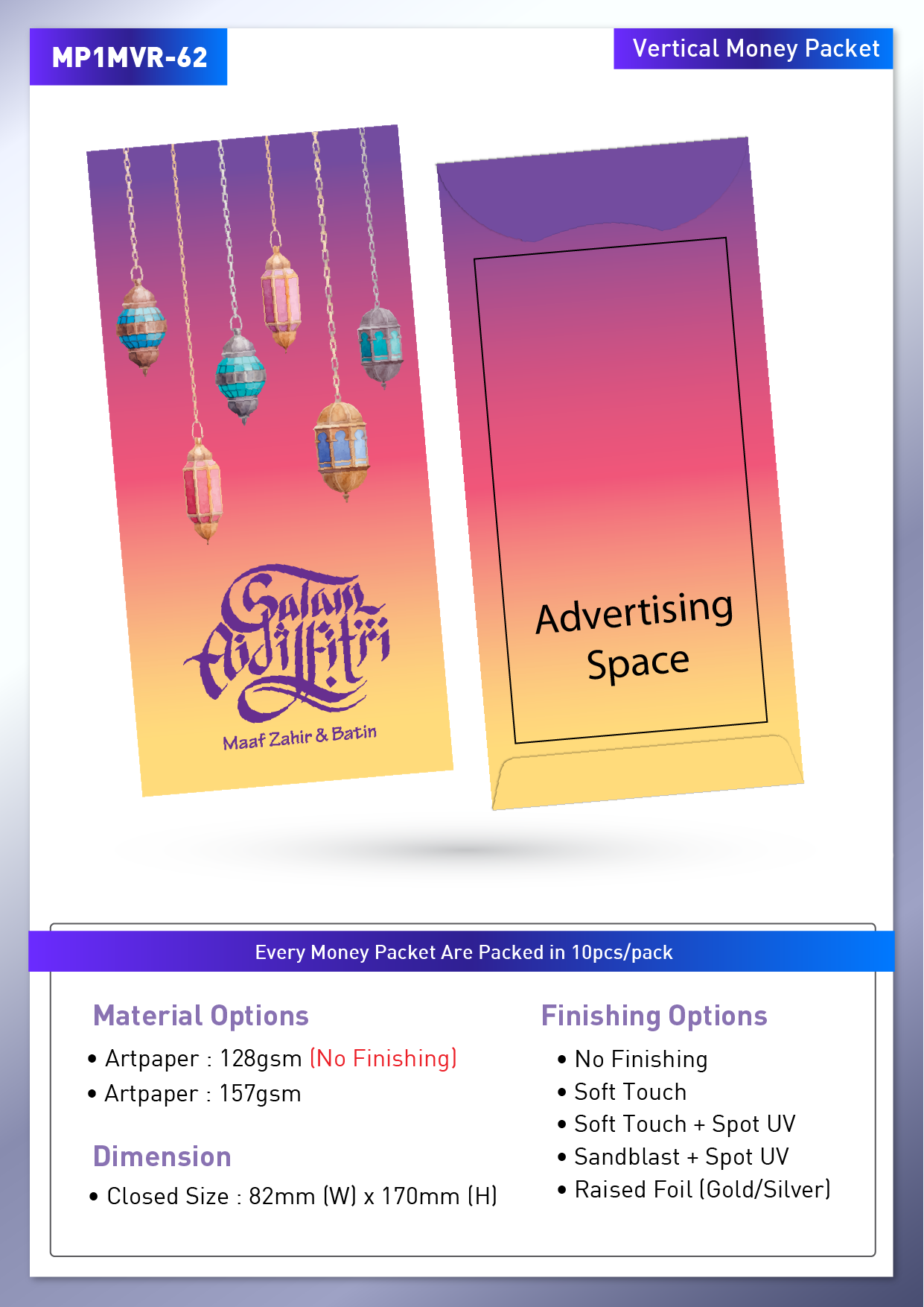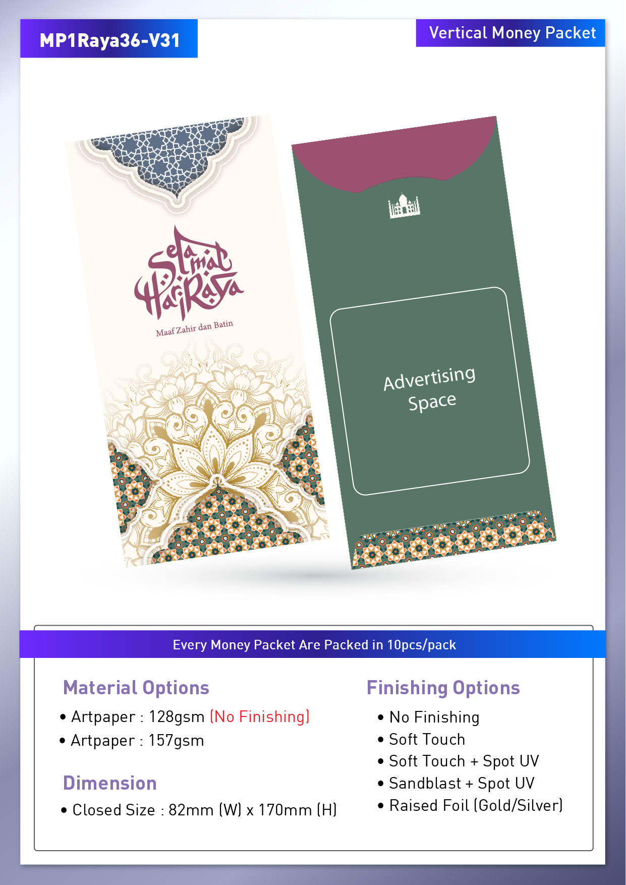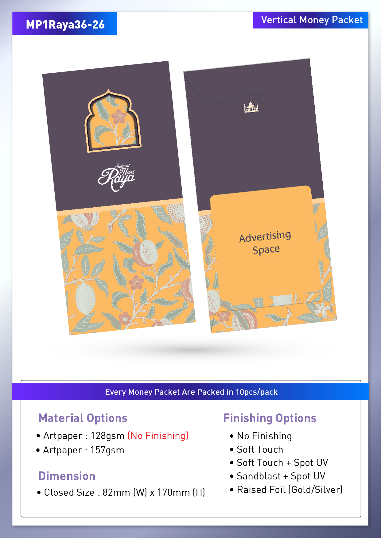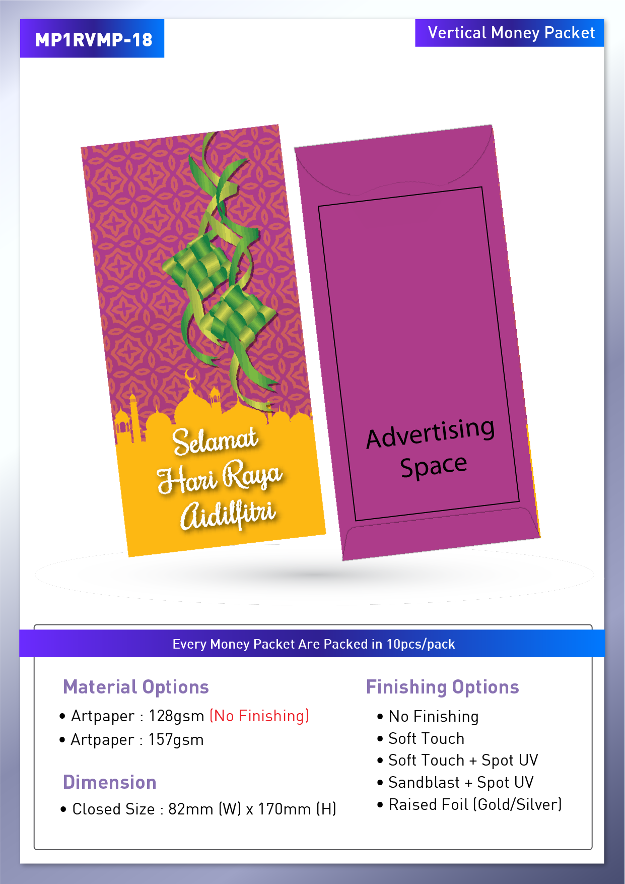 “Discover our exclusive Sampul Raya 2026 collection, featuring elegant and festive designs perfect for gifting during Hari Raya. Choose from our beautifully curated design collection and simply add your logo, or provide your own custom design for us to print for a truly personalized touch. Ideal for both corporate and personal use, our premium-quality money packets make every gift memorable this festive season.”